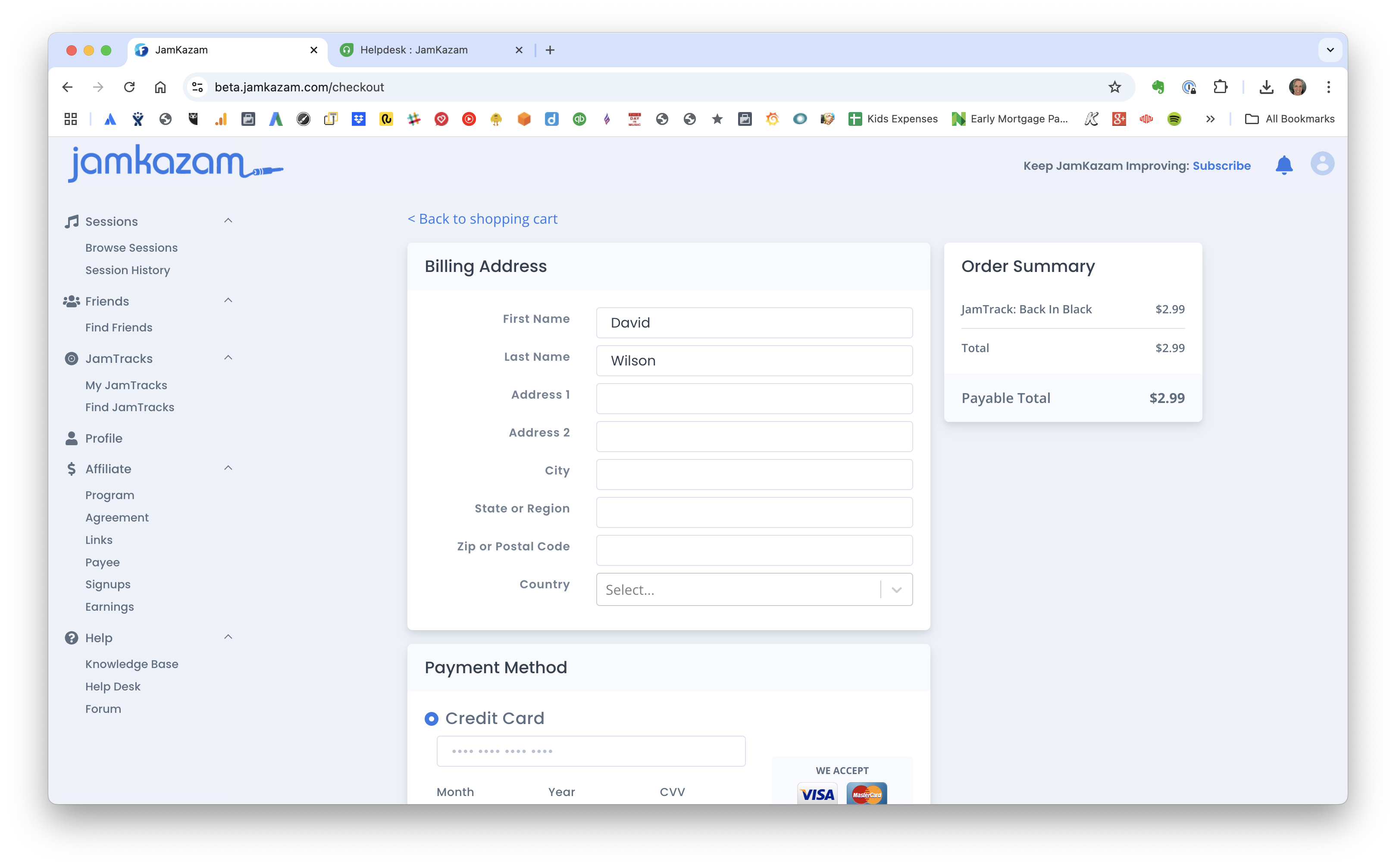 From the shopping cart page, you can click the white Continue Shopping button to go back to the Find JamTracks page to find and add more songs to your cart, if you're planning to buy multiple songs. Otherwise, you can click Checkout to move forward with your purchase (see screenshot below).