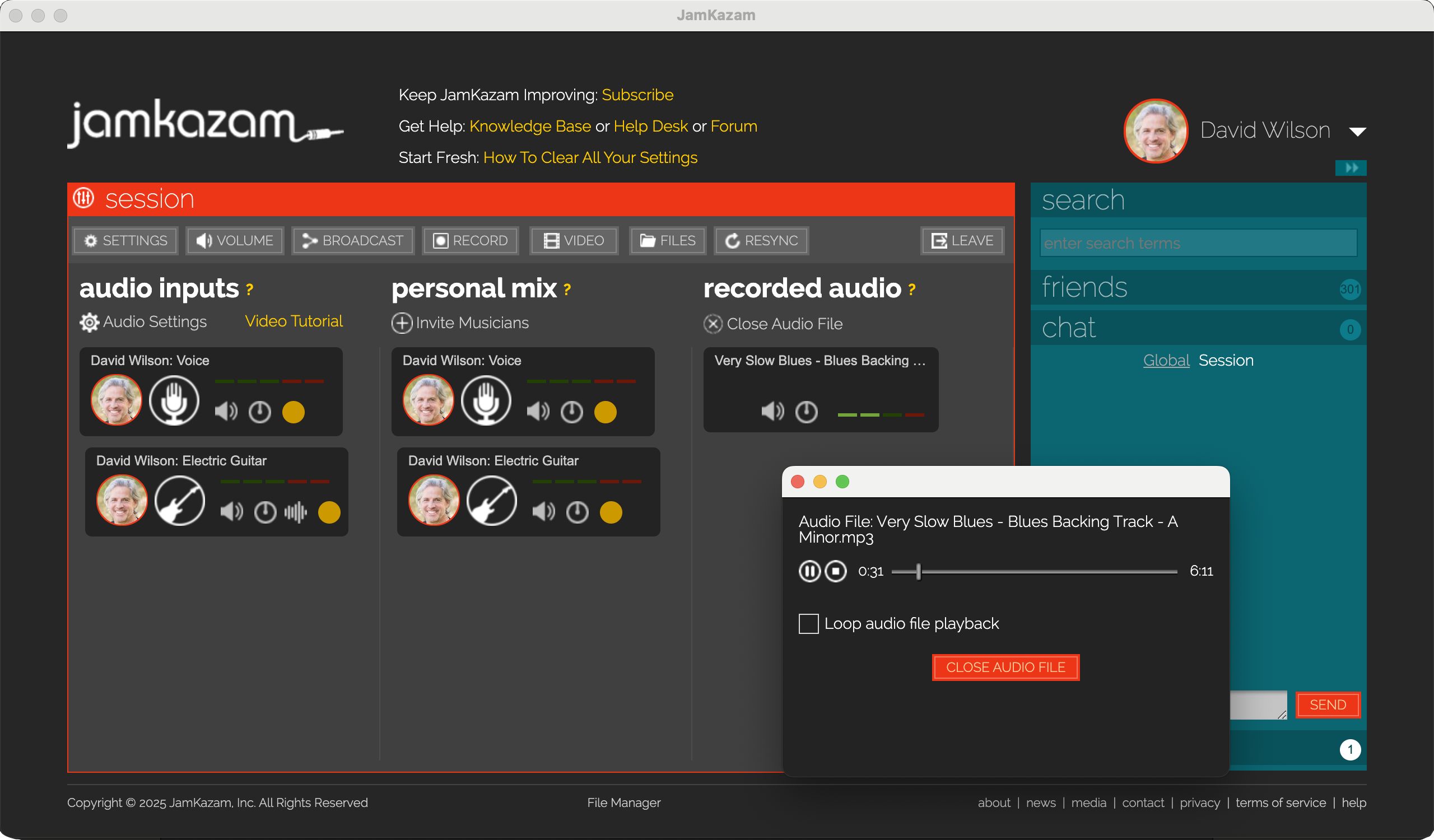 It's often useful in online instruction sessions to use backing tracks. For example, a flute student might play along with a recorded piano accompaniment, or a guitar student might improvise over a blues backing track. This is made easy in JamKazam, as you can open .mp3, .wav, and other common audio file formats in the app, play the audio file, and the audio of your live performance is mixed with the playback of the backing track (see screenshot below). You can control the level/volume of the backing track relative to your live performance using the same personal mix controls on the backing track.
